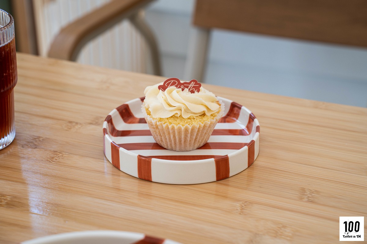 甜點除了烤布蕾,還有紅絲絨、巧克力、香蕉、藍莓四款杯子蛋糕。藍莓杯子蛋糕口感濕潤鬆軟,單吃就蠻香的。我忍不住向店員稱讚,才發現原來甜點師就坐在隔壁,可愛小插曲,當下真有點拍謝!(笑)