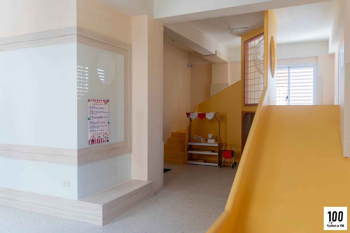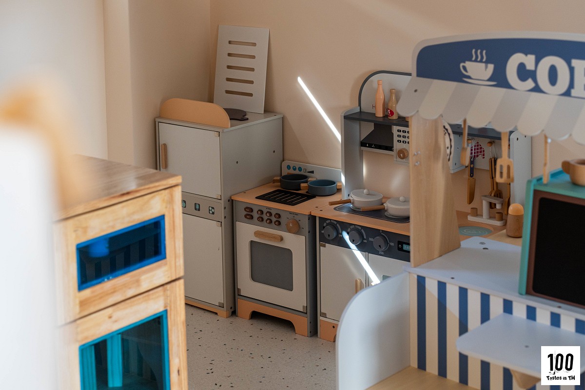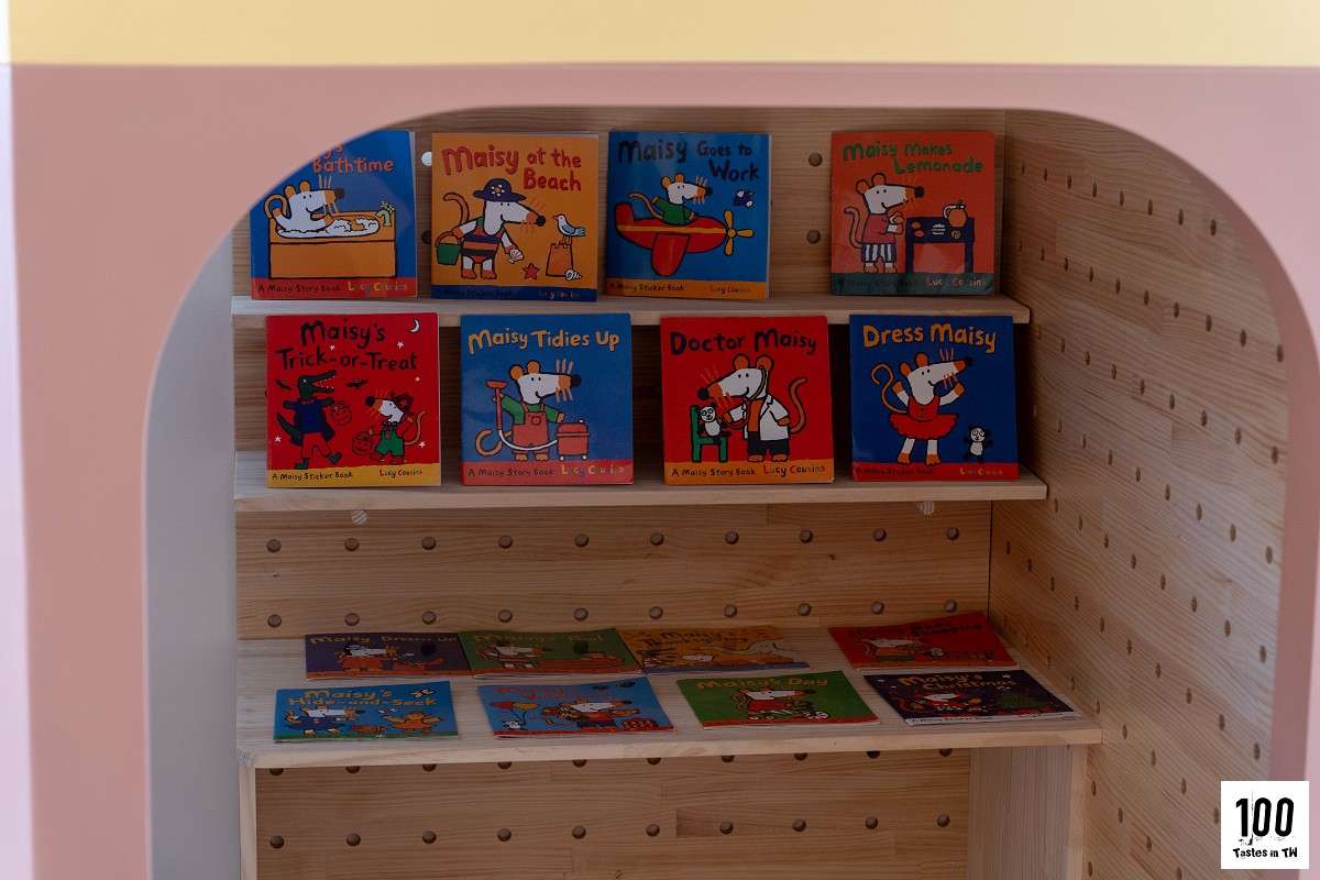 溜滑梯下方規劃了像「秘密基地」的一隅,裡面有迷你廚房、玩具咖啡廳等設施;書架上擺著多本小鼠波波(Maisy)繪本,童趣又溫馨。